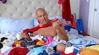 Photos description: "Clean Your Room". Irresponsible teen Megan Rain Was loafing on the couch while music blared into her ears from her headphones. Her mom was fed up with her lazy ways and demanded she clean her room immediately. Meanwhile, Sean thought nobody was home and wanted to take the opportunity to perv out and sniff her pile of dirty panties and other miscellaneous articles of clothing. He heard Megan walking down the hall and coming his way so he had to think fast and chose to hide under the heaping mound of clothes on her bed. As she started to clean up she uncovered his raging hard on and was startled to say the least! As much as a surprise as it was, she was more shocked and impressed by his huge cock so she decided to tidy up his balls by sucking and fucking them dry.